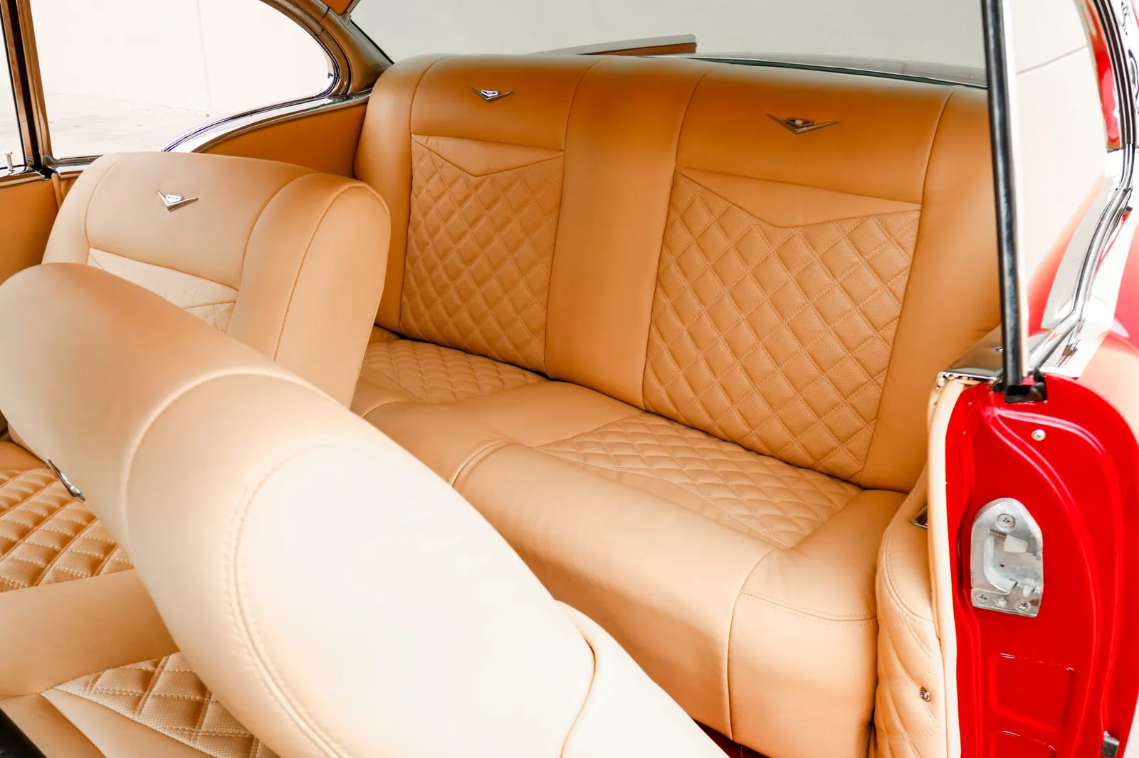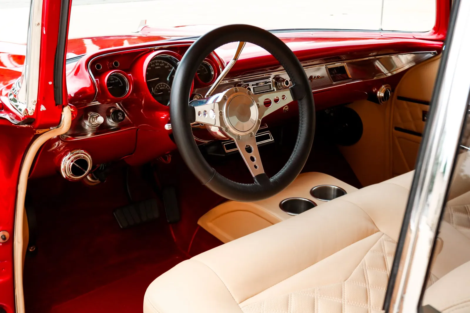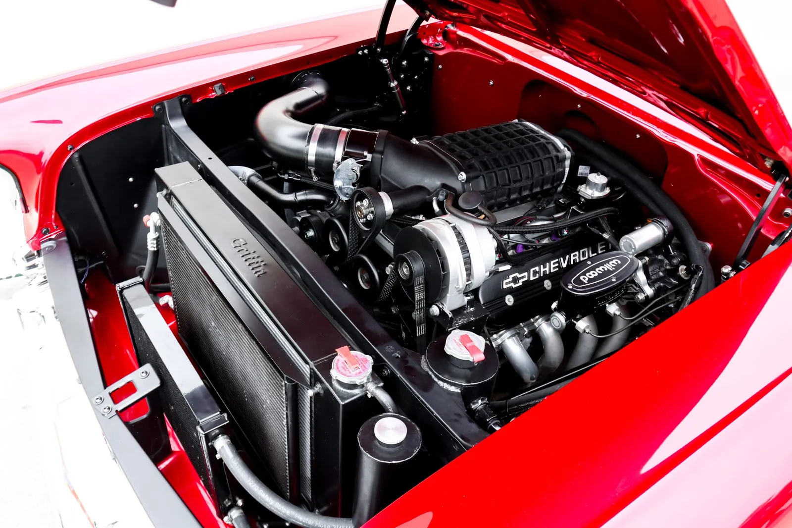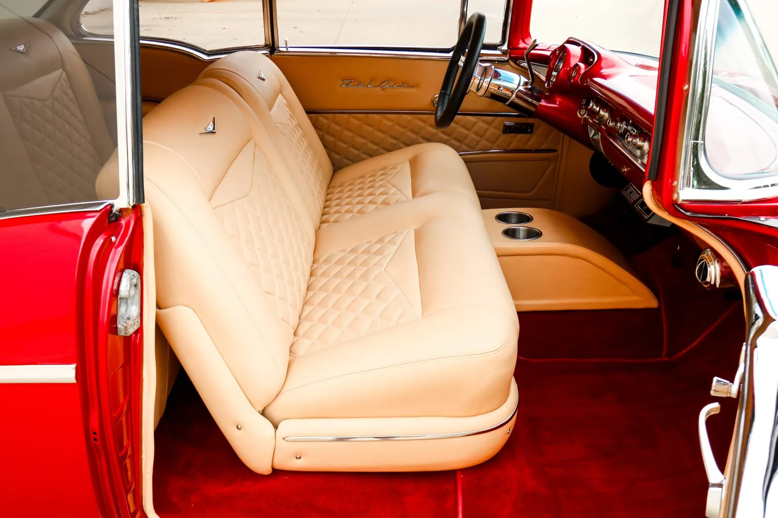 This modified 1957 Chevrolet Bel Air 2-Door Hardtop is finished in red over tan leather and powered by a Magnuson-supercharged 408ci Vortec V8 paired with a 4L80E 4-speed automatic transmission. Built on an Art Morrison chassis, it blends iconic Tri-Five style with modern street machine performance.