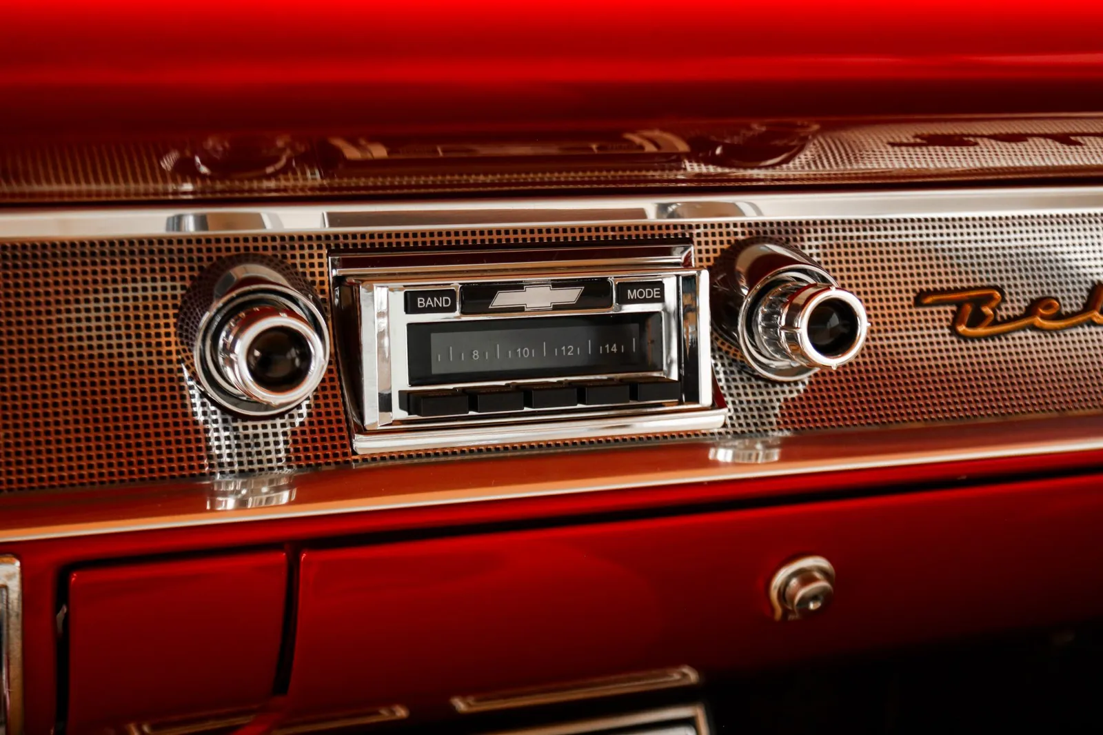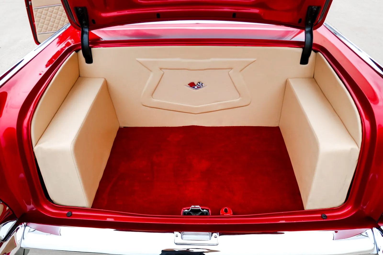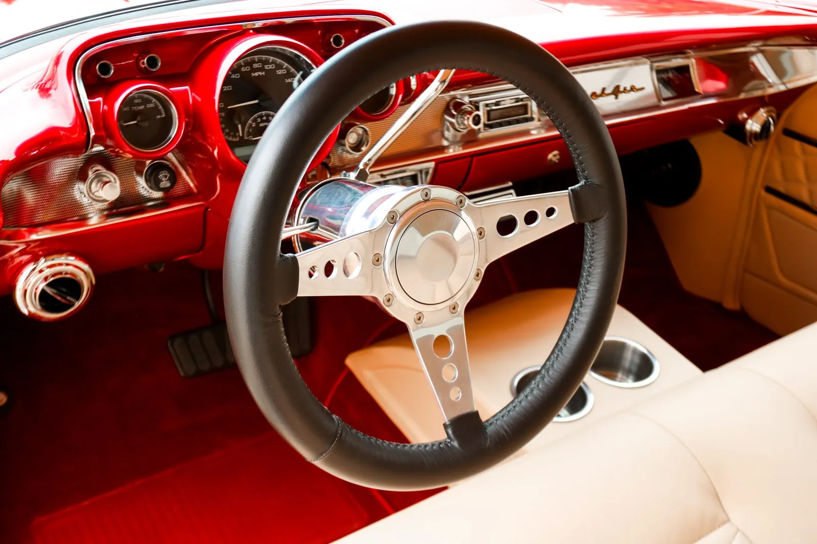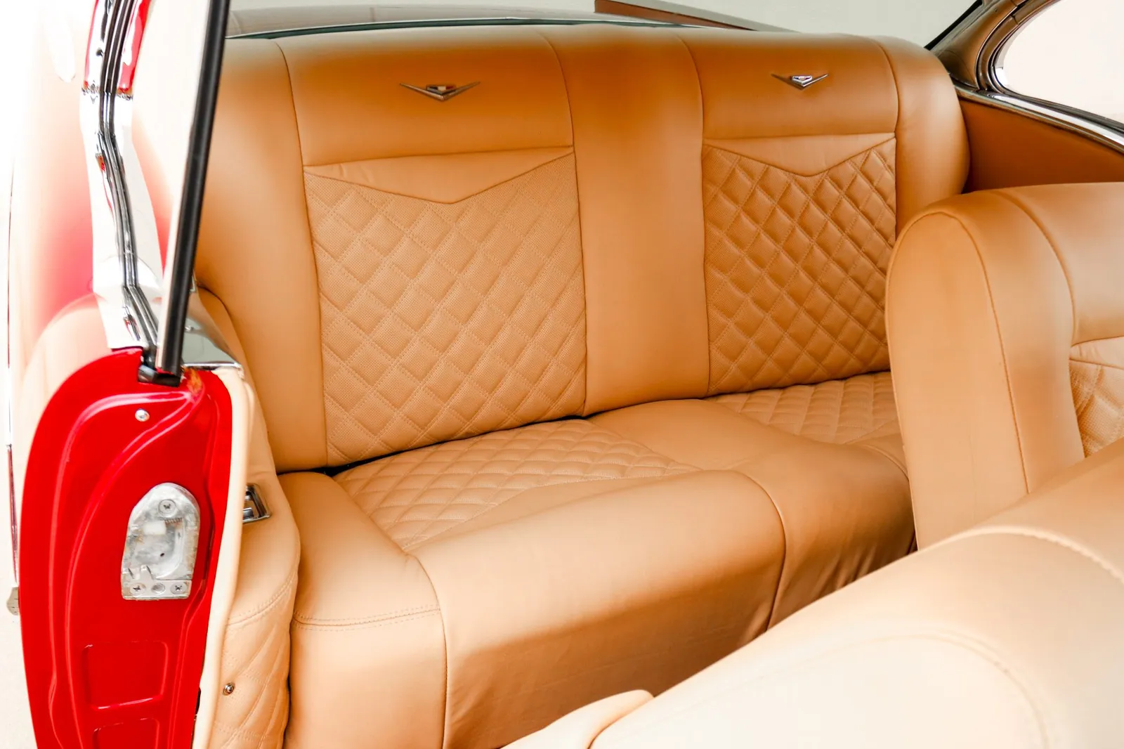 This modified 1957 Chevrolet Bel Air 2-Door Hardtop is finished in red over tan leather and powered by a Magnuson-supercharged 408ci Vortec V8 paired with a 4L80E 4-speed automatic transmission. Built on an Art Morrison chassis, it blends iconic Tri-Five style with modern street machine performance.
