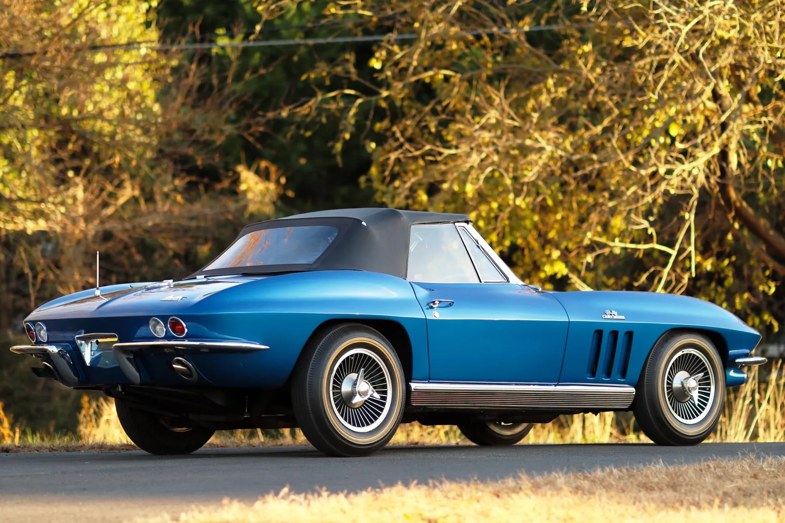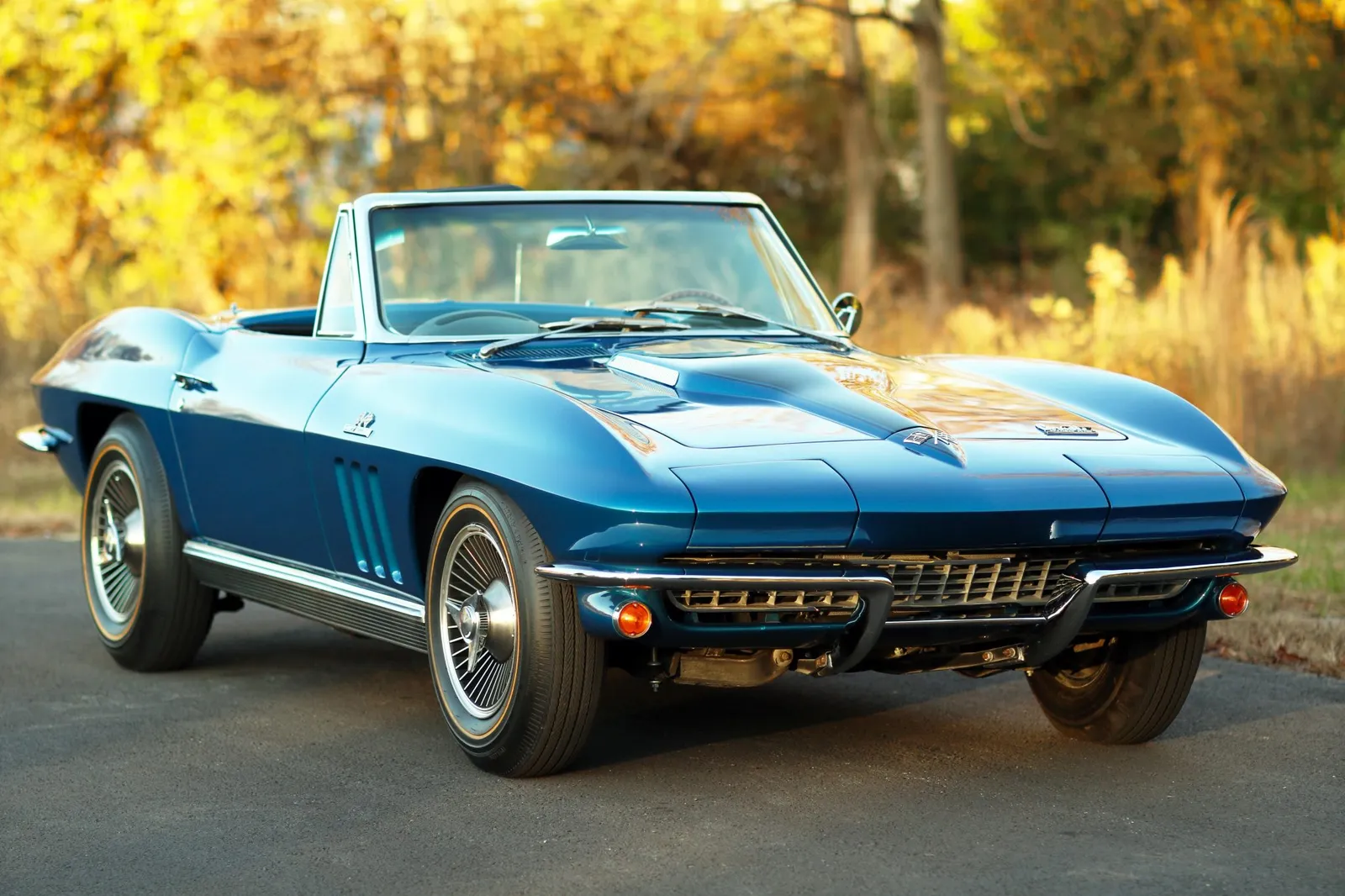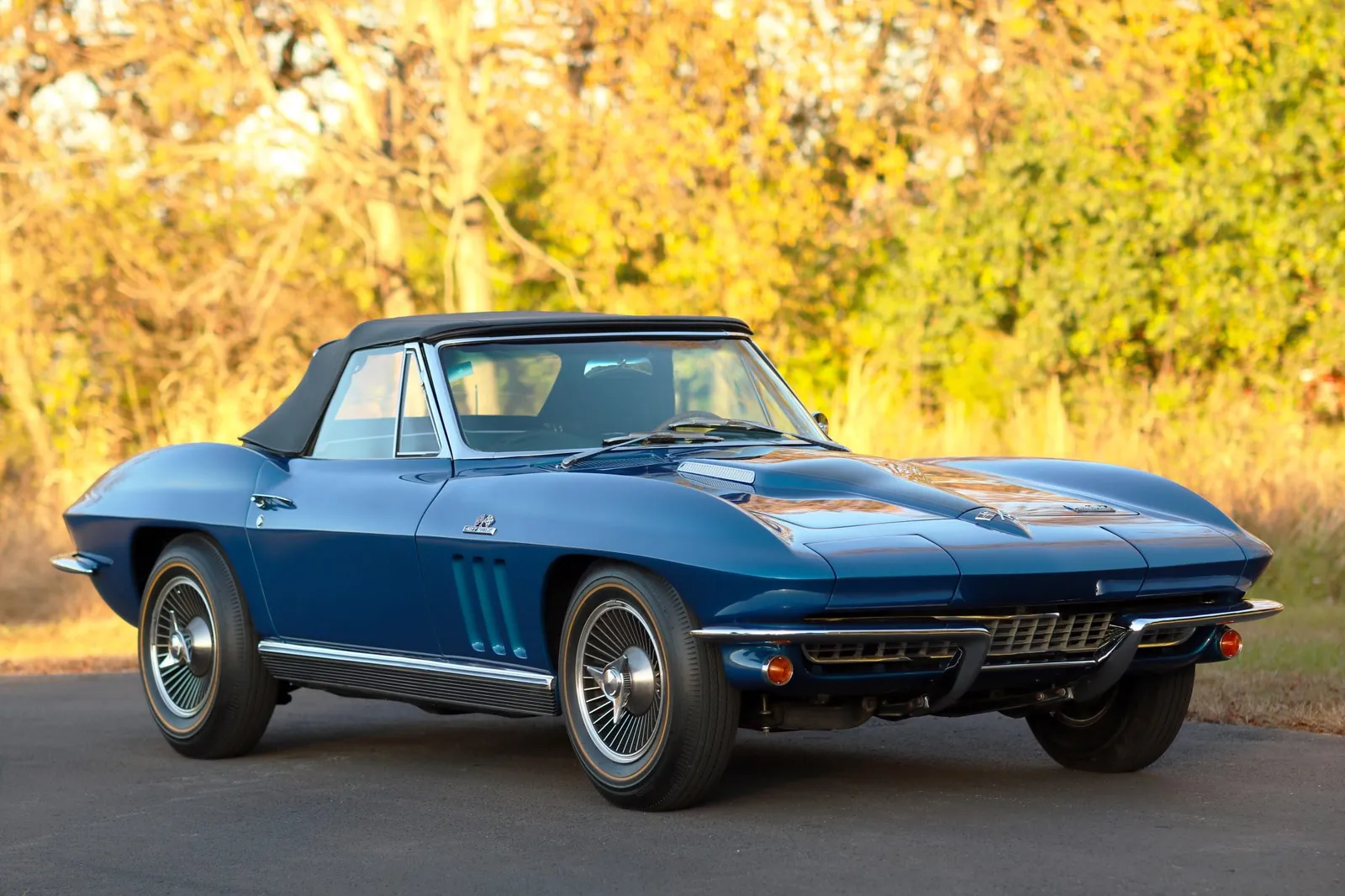 This 1966 Chevrolet Corvette Convertible is finished in metallic blue with a black soft top over matching vinyl and powered by a numbers-matching 427ci L72 V8 paired with a 4-speed manual transmission. A desirable big-block C2 Corvette with serious collector appeal and premium showroom presence.
