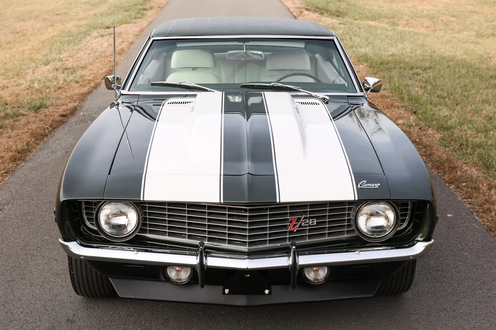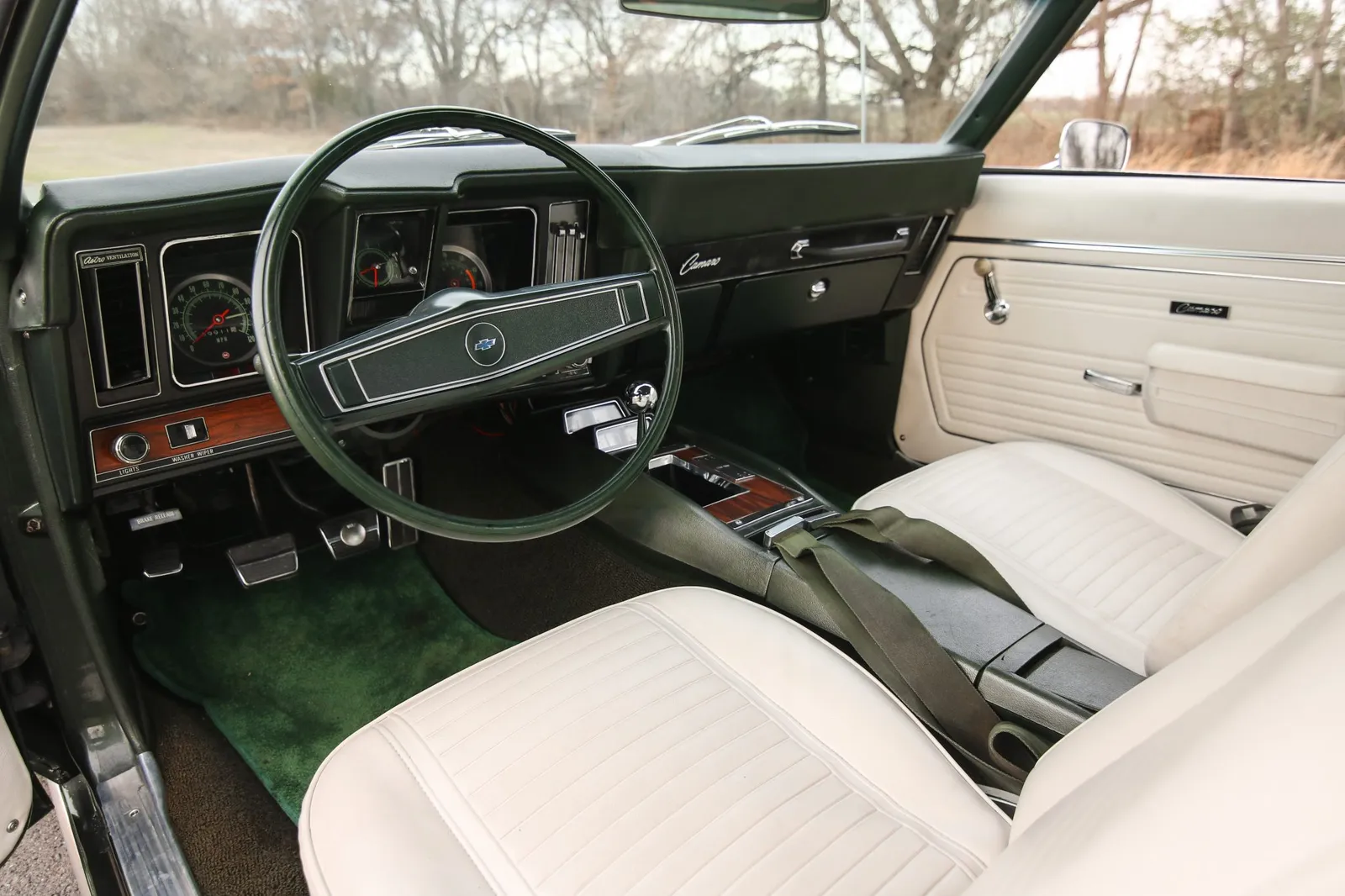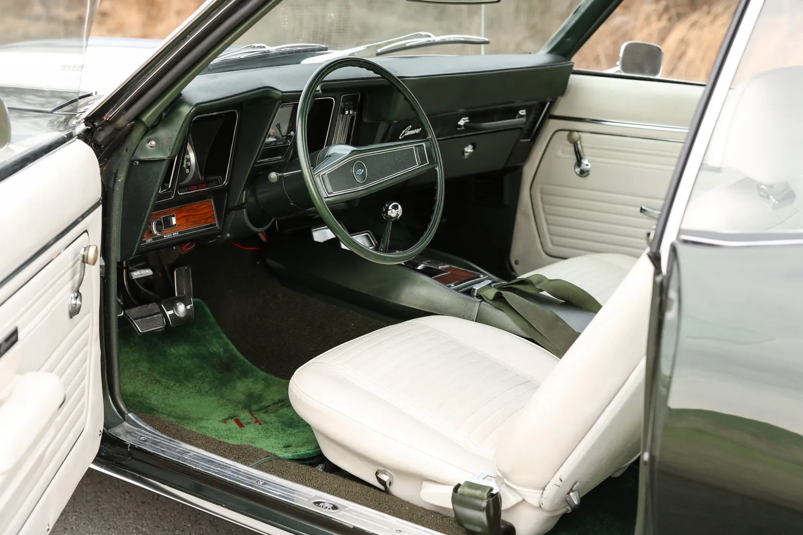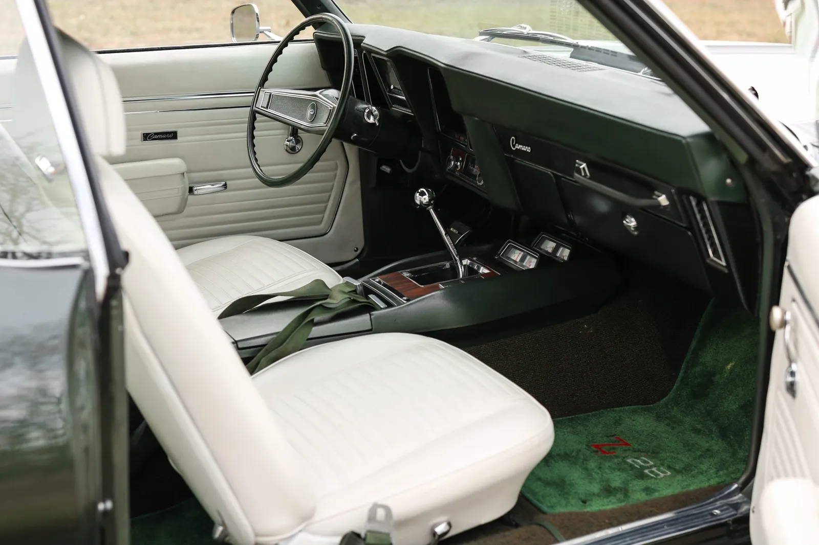 This 1969 Chevrolet Camaro Z/28 is finished in Fathom Green with white stripes over white vinyl and powered by a 302ci V8 paired with a Muncie M20 4-speed manual transmission. A highly sought-after first-generation Z/28 with strong collector appeal and authentic muscle car character.
