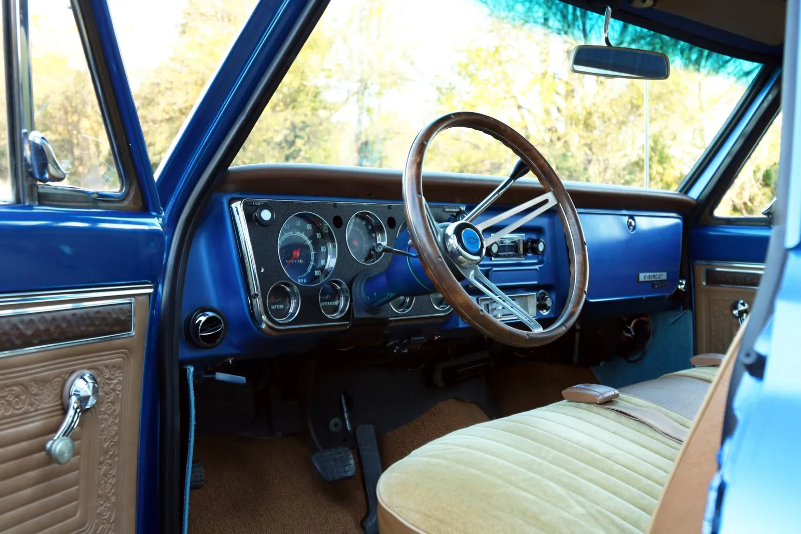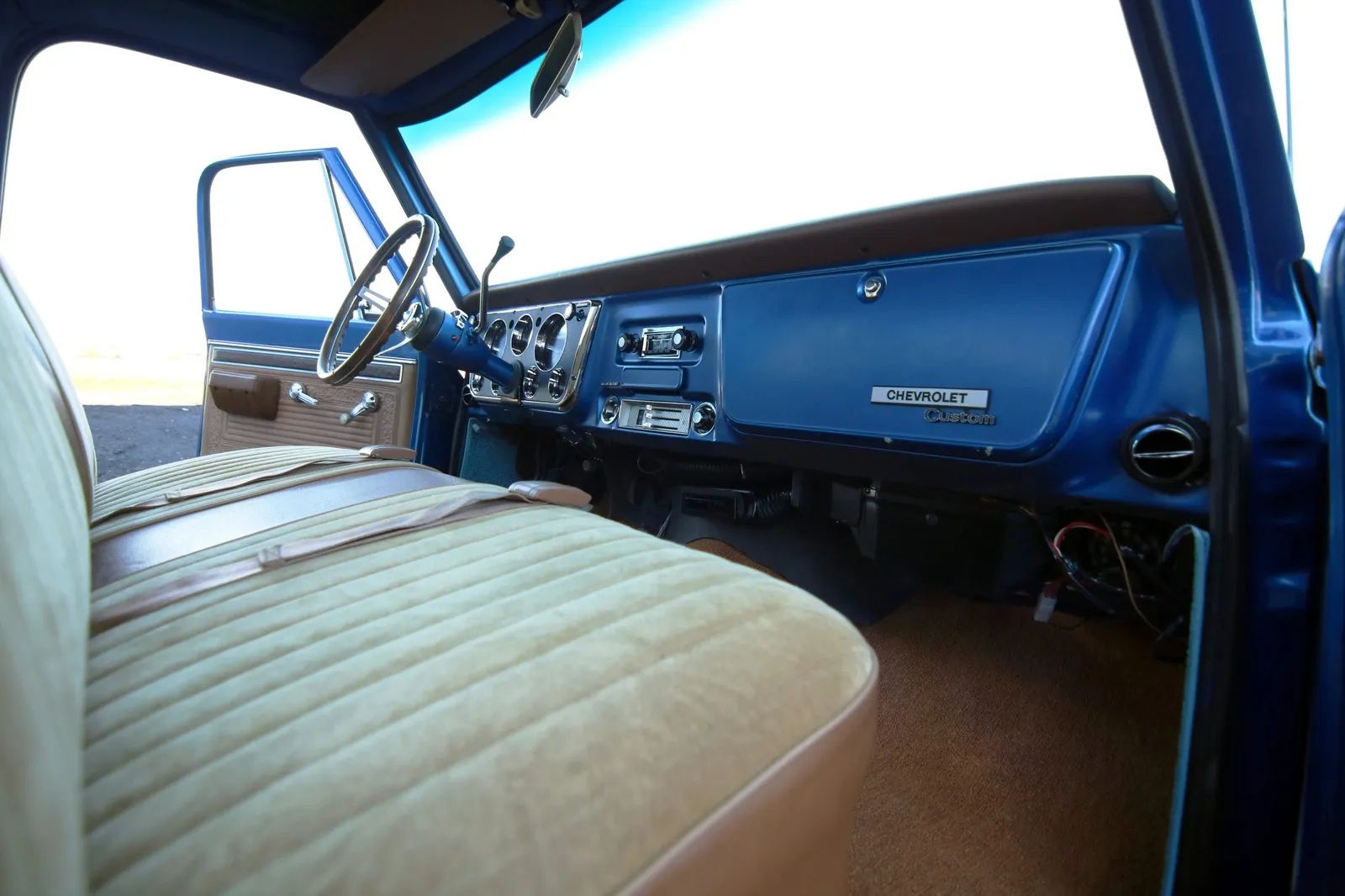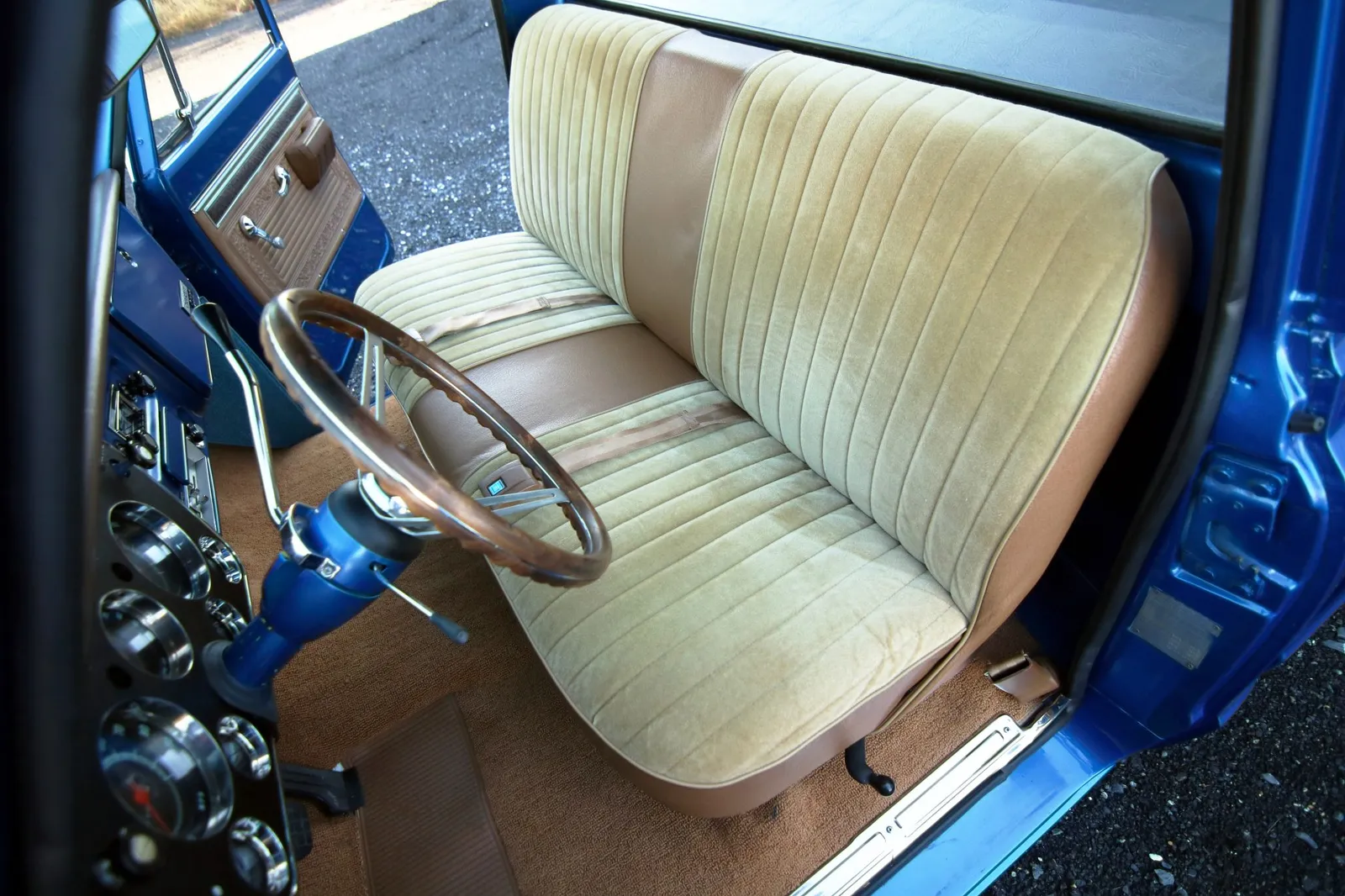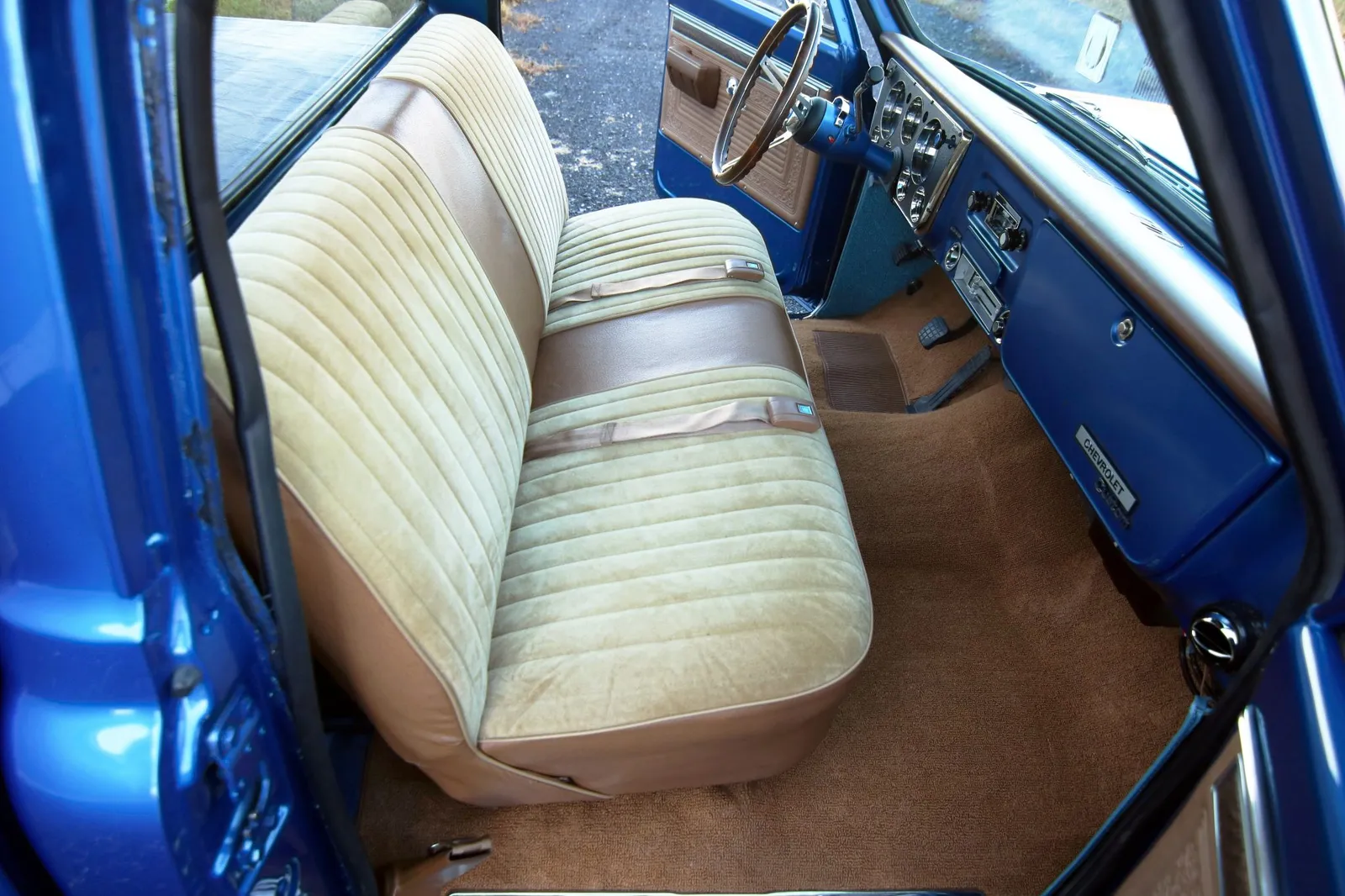 This 1970 Chevrolet C10 Pickup is finished in metallic blue over a brown and tan interior and powered by a 5.7-liter LT1 V8 paired with a 4-speed automatic transmission. Modern drivetrain upgrades and clean short-bed styling make this C10 a versatile classic truck listing.