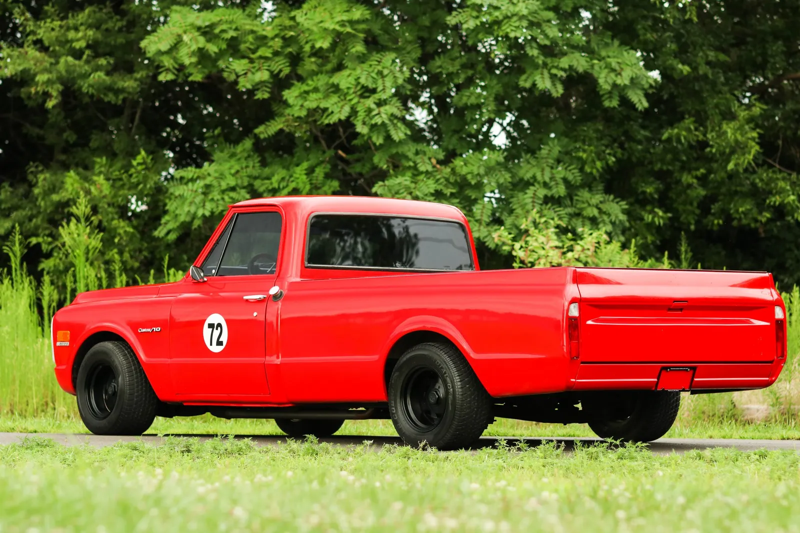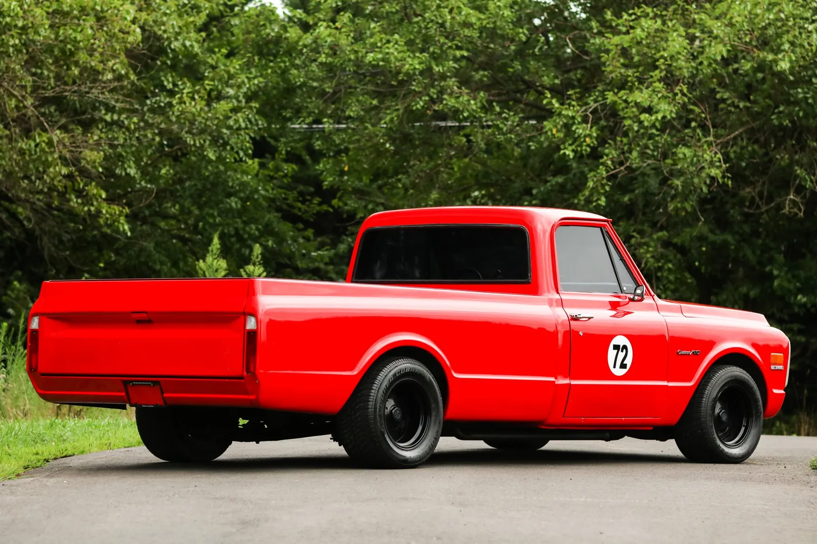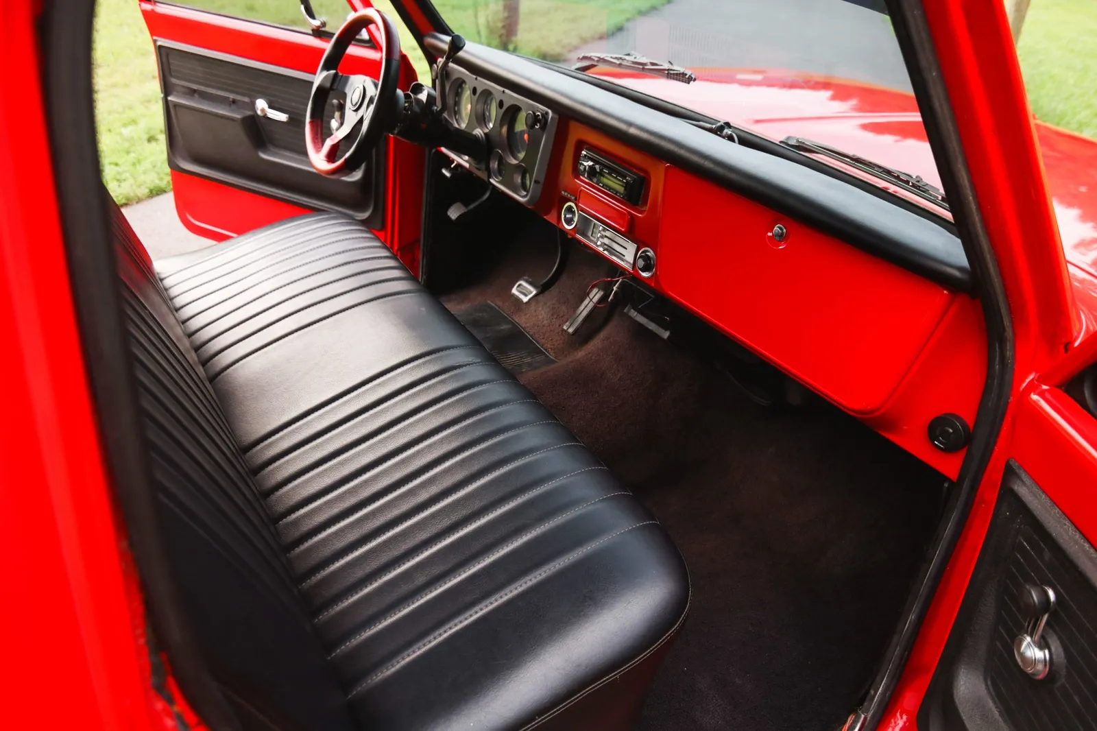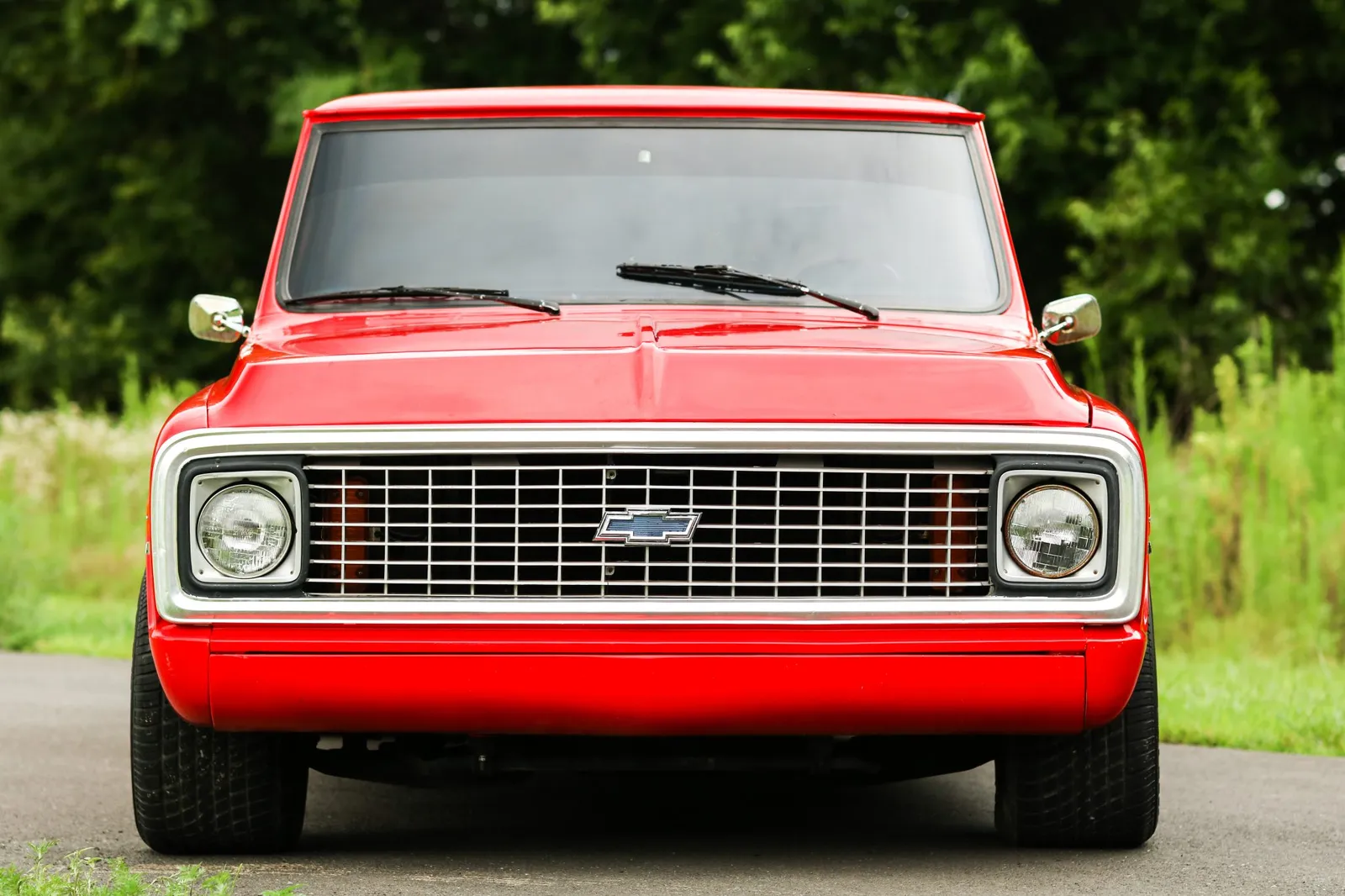 This 1972 Chevrolet C10 Pickup is finished in red with ghost flames over black vinyl and powered by a 350ci V8 paired with a 3-speed automatic transmission. A custom square-body style truck with hot rod flavor and standout visual presence for truck and classic inventory.