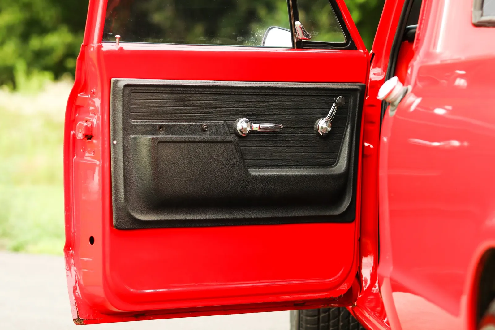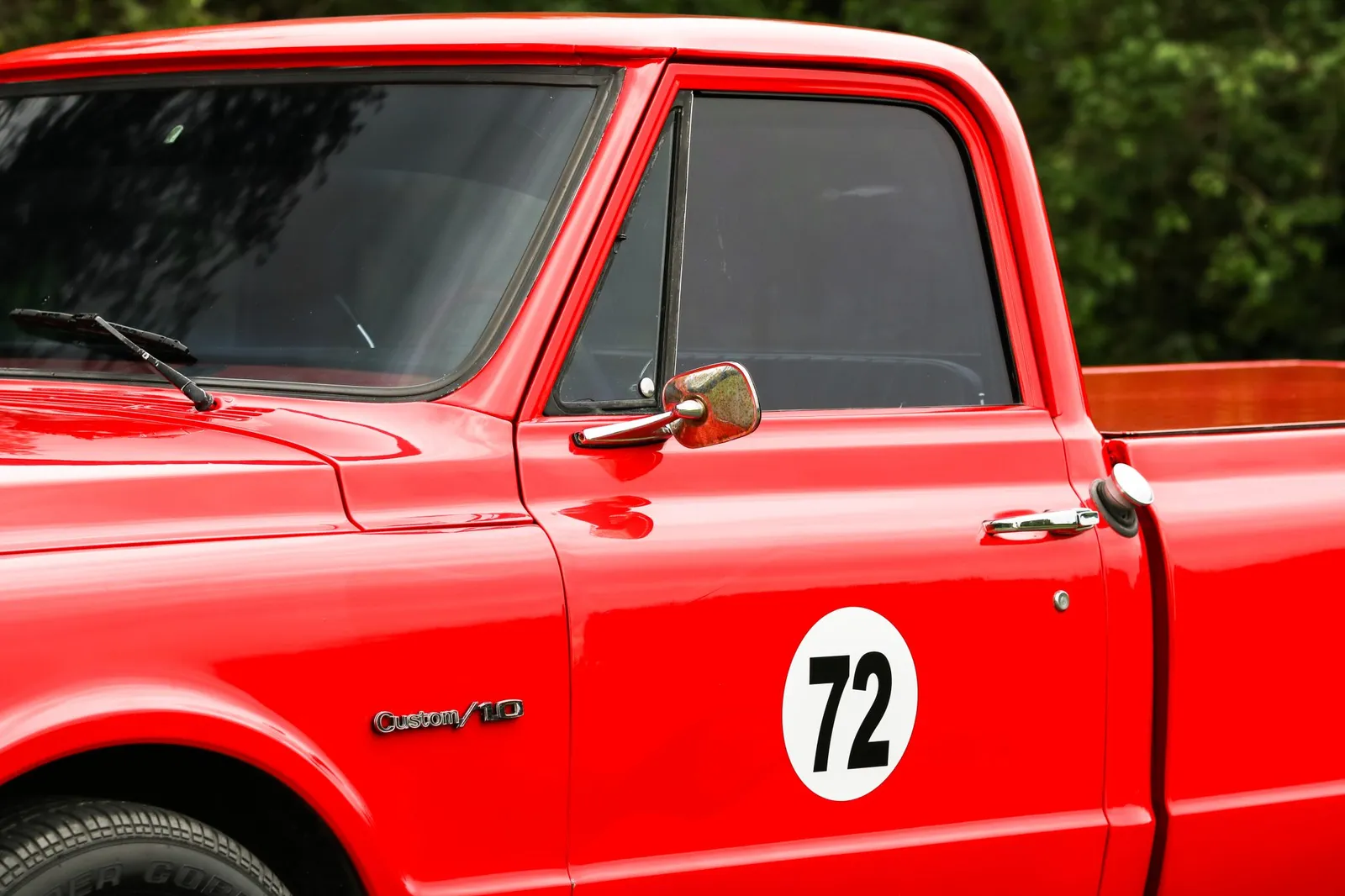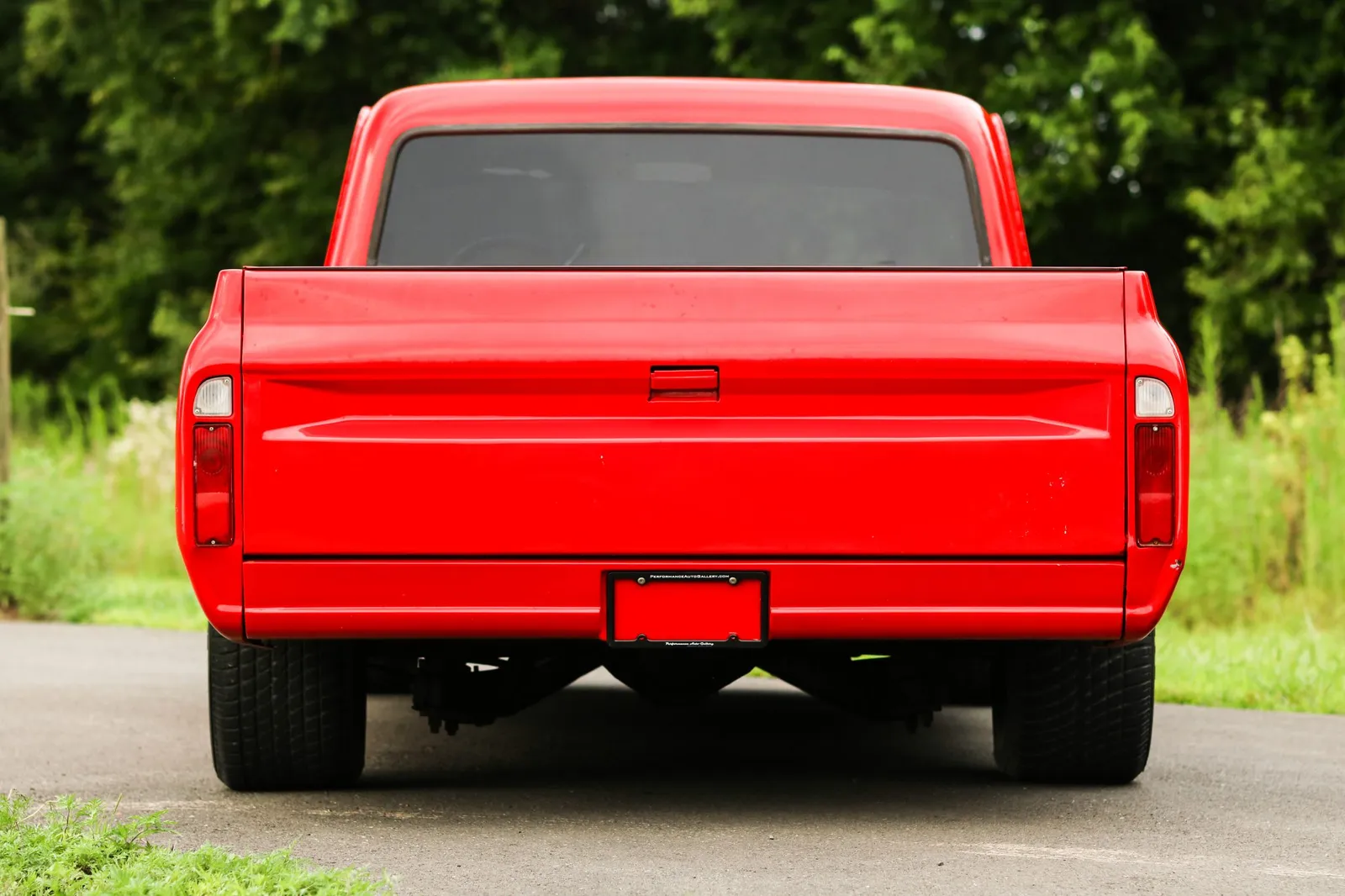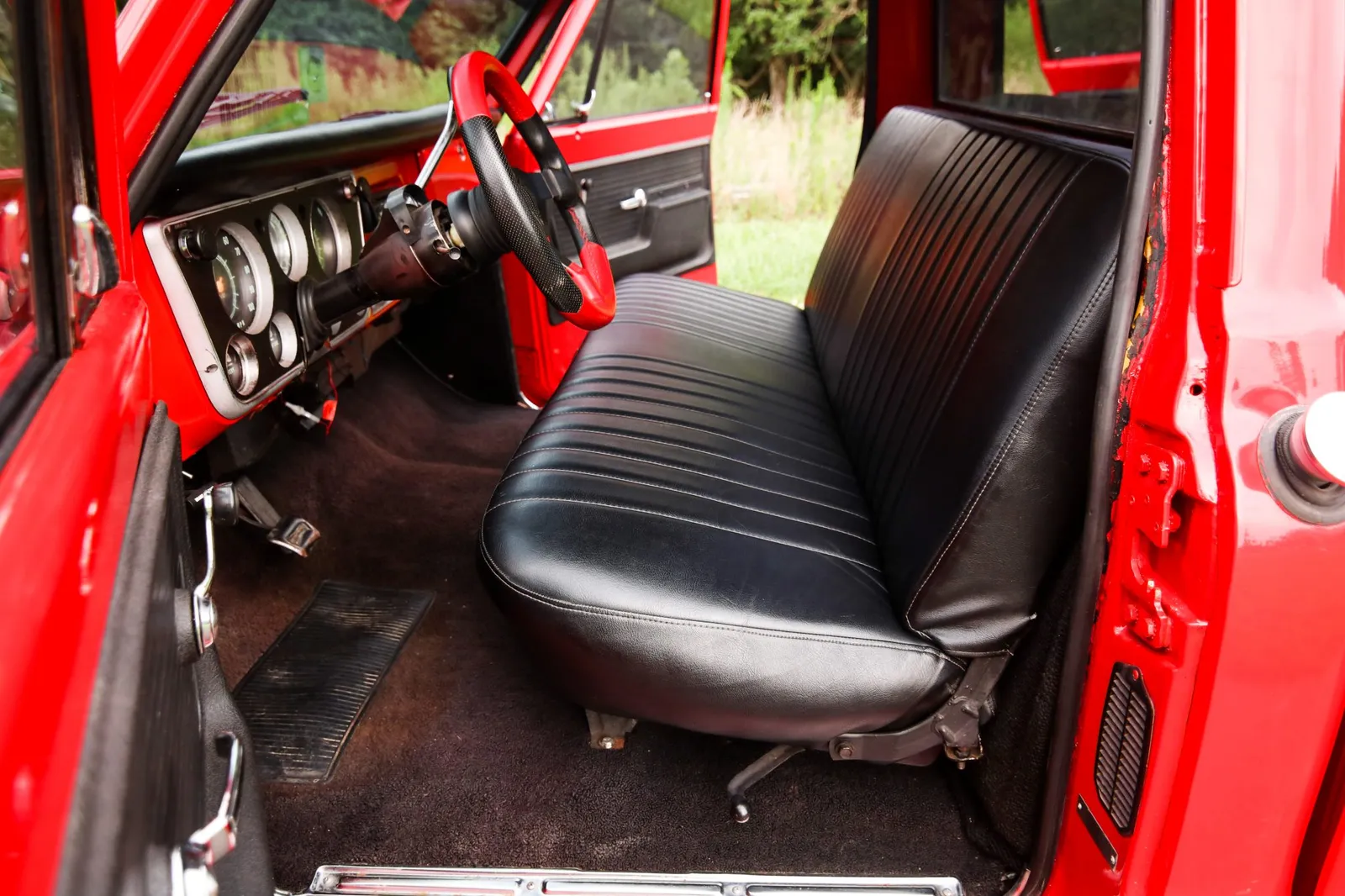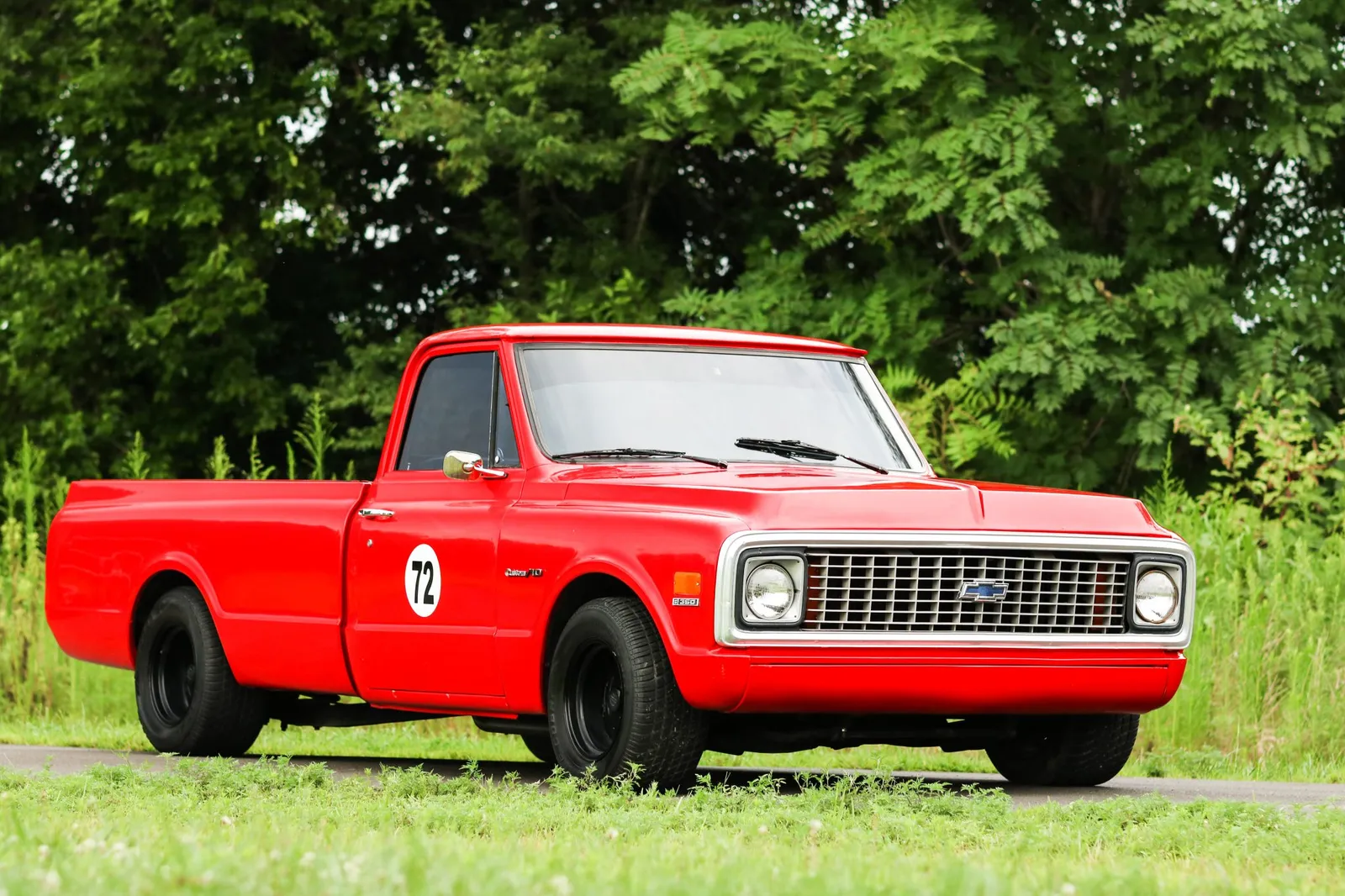 This 1972 Chevrolet C10 Pickup is finished in red with ghost flames over black vinyl and powered by a 350ci V8 paired with a 3-speed automatic transmission. A custom square-body style truck with hot rod flavor and standout visual presence for truck and classic inventory.
